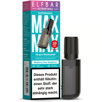 Der Blueberry Sour Raspberry Pod von Elfbar Max enthält 10ml Nikotinsalz-Liquid und ist kompatibel mit dem Elfbar Max Akku. Direkt einsetzbar – kein Nachfüllen notwendig.